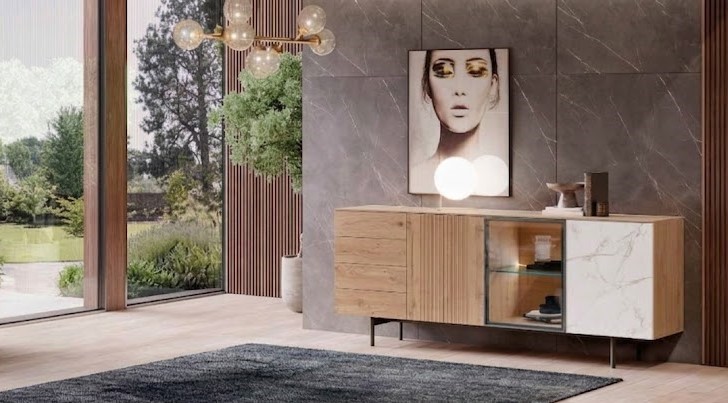 Uma peça que redefine a elegância através do contraste entre o calor da madeira e o rigor do mármore cerâmico. O seu design de linhas puras é preservado pelo sistema push-to-open, que elimina puxadores e oferece uma abertura fluida ao mais leve toque. O grande diferencial reside na sua vitrine equipada com KIT LED integrado, criando um jogo de luz e sombra que não só valoriza os seus objetos de eleição, como banha o ambiente com uma iluminação ambiente sofisticada e acolhedora.