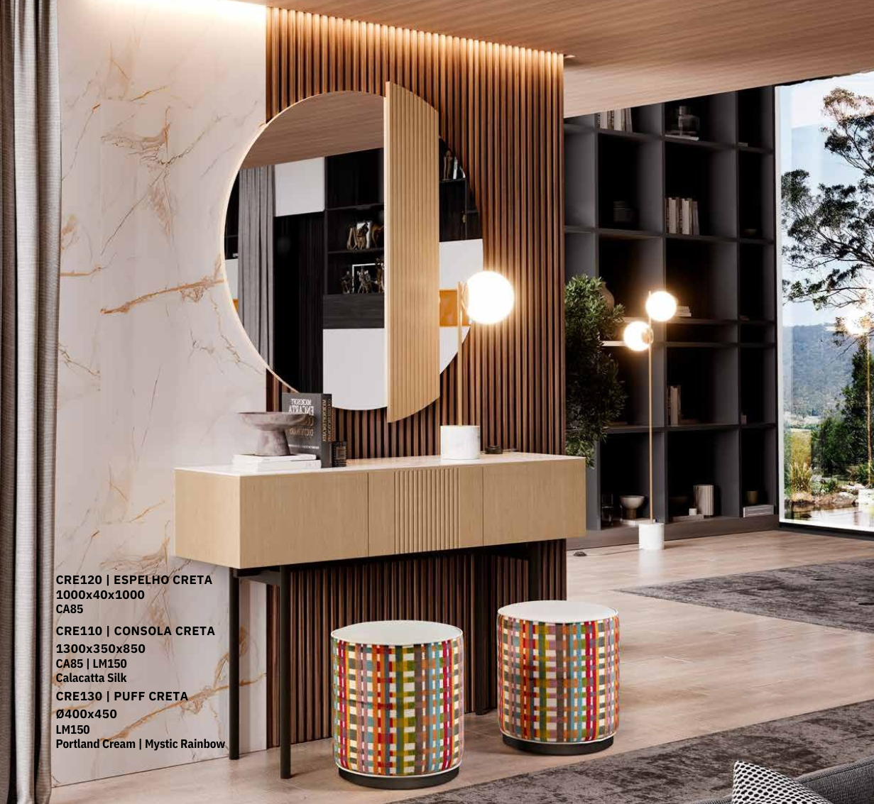 - Espelho Creta: Design circular exclusivo com painel lateral ripado em madeira,