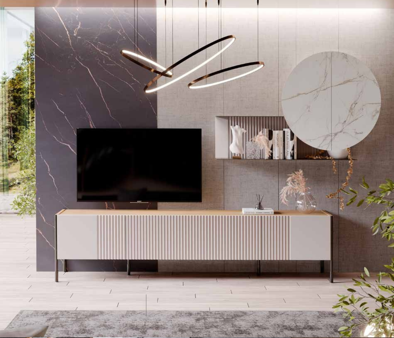 - Móvel TV Rhodes 01: Uma peça de presença marcante com 250 x 45 x 60 cm.