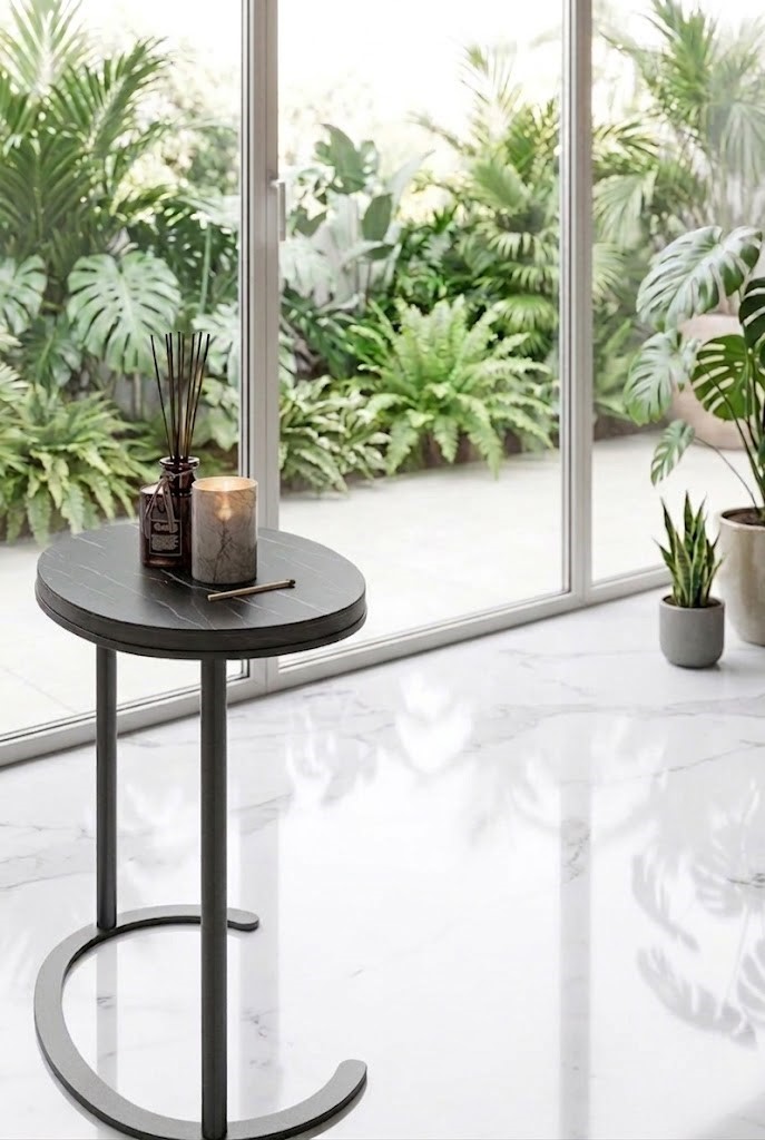 - Estrutura Minimalista: Base em ferro lacado mate, garantindo durabilidade e uma