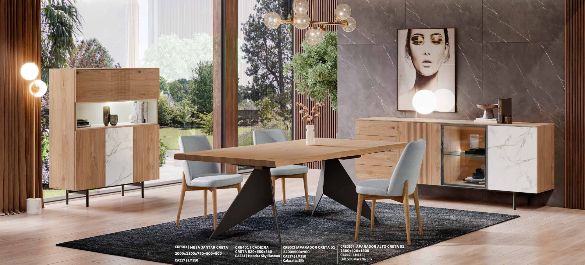 A Sala de Jantar Creta 01 evoca uma sensação de serenidade e requinte, através de um diálogo harmonioso entre o calor texturizado da madeira ripada clara e a nobreza atemporal das superfícies com efeito mármore Calacatta. Um ambiente que convida a momentos memoráveis em torno da mesa.