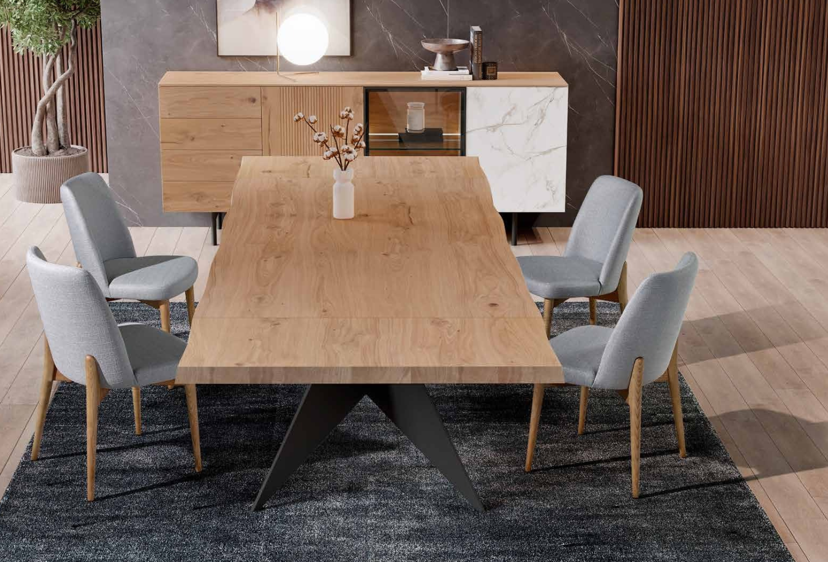 Mesa de Jantar Creta: O centro das atenções. O tampo substancial com acabamento em madeira assenta sobre uma base escultórica em metal escuro, criando um contraste visual impressionante.