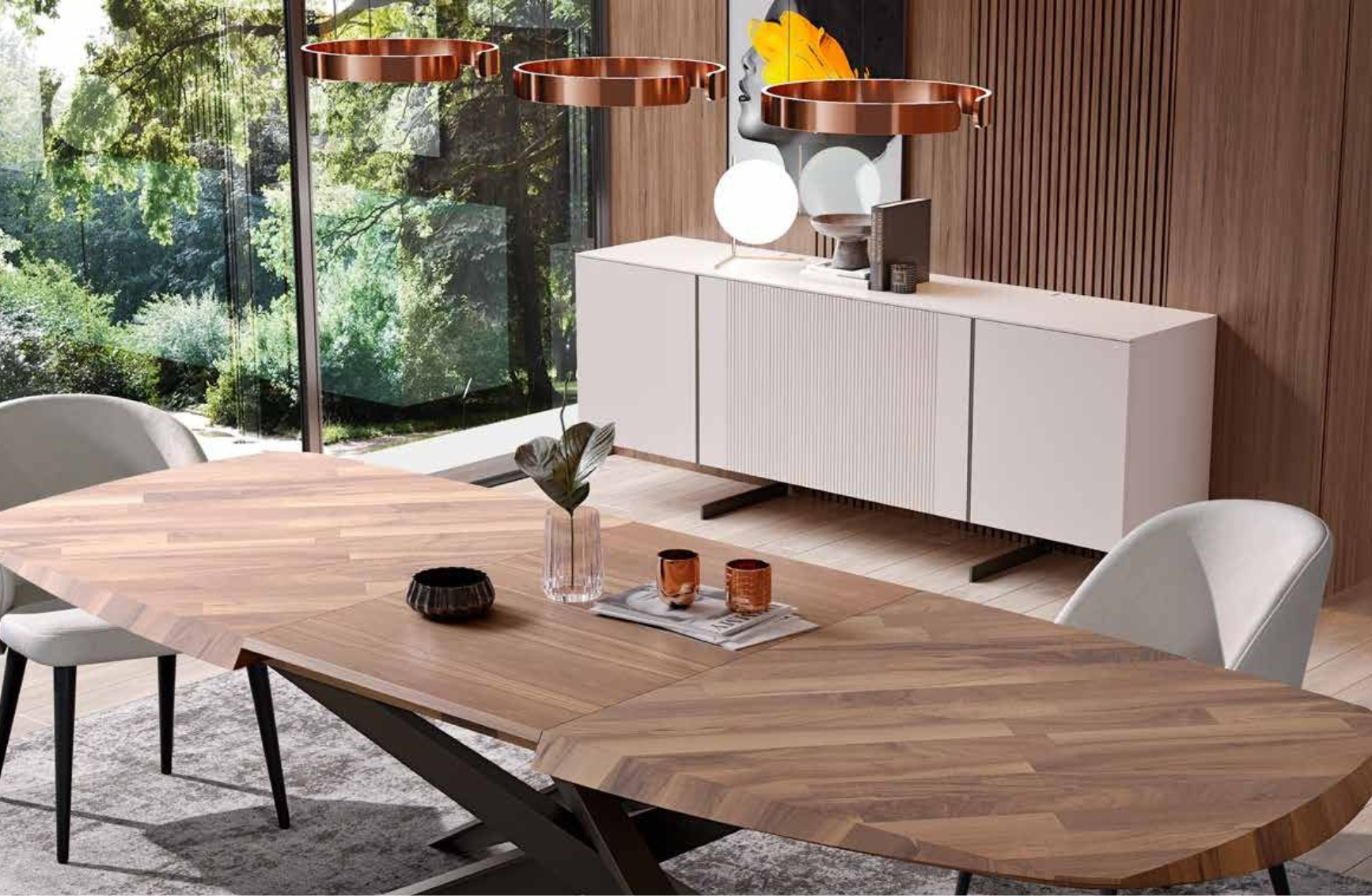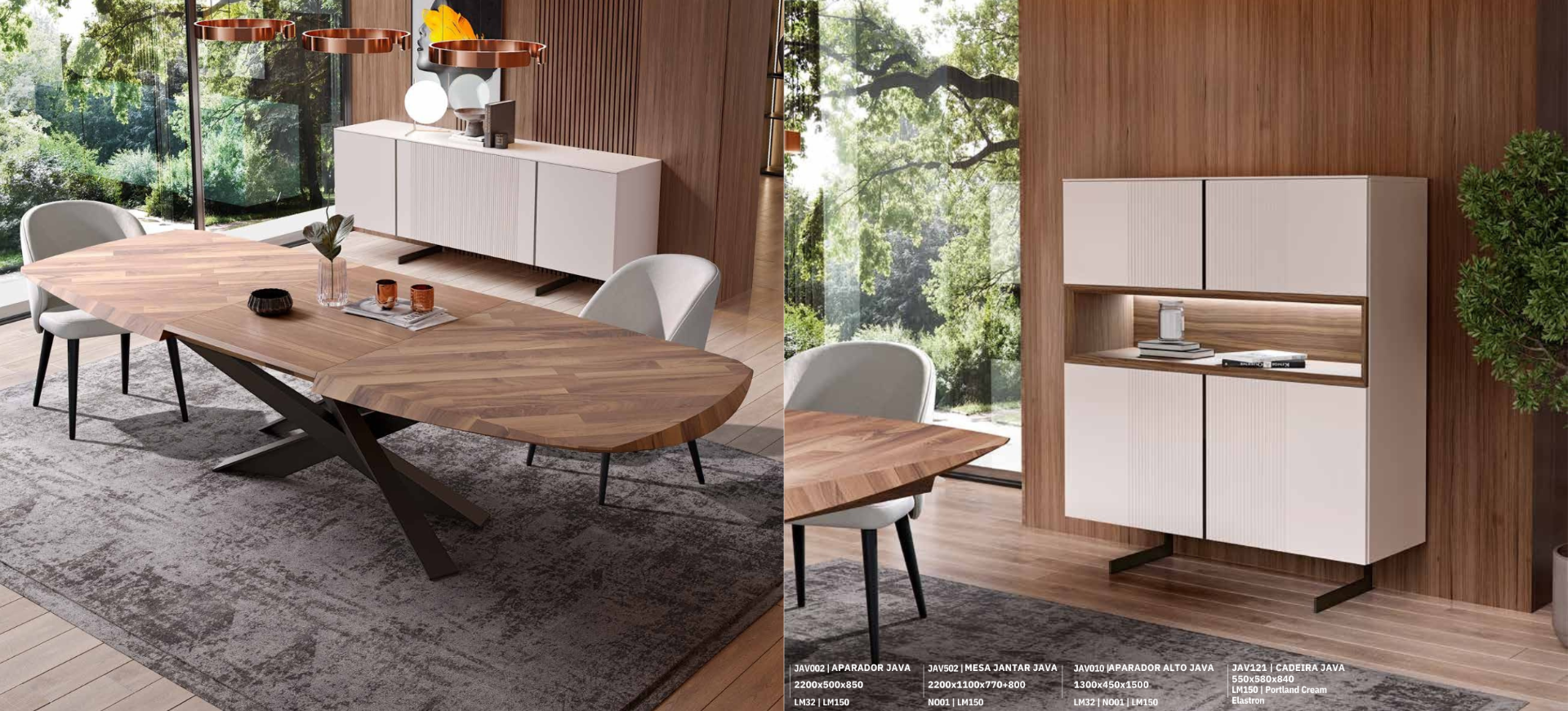 Mesa de Jantar Java: O grande protagonista deste conjunto é o tampo com acabamento em espinha Parket, que confere uma textura nobre e um dinamismo visual único. A mesa é suportada por uma base central em ferro lacado mate, disponível em duas variantes para garantir a estabilidade perfeita: pé de 115cm (para mesas de 180 a 200cm) e pé de 155cm (para medidas entre 220 e 280cm). Disponível nas opções fixa ou extensível.