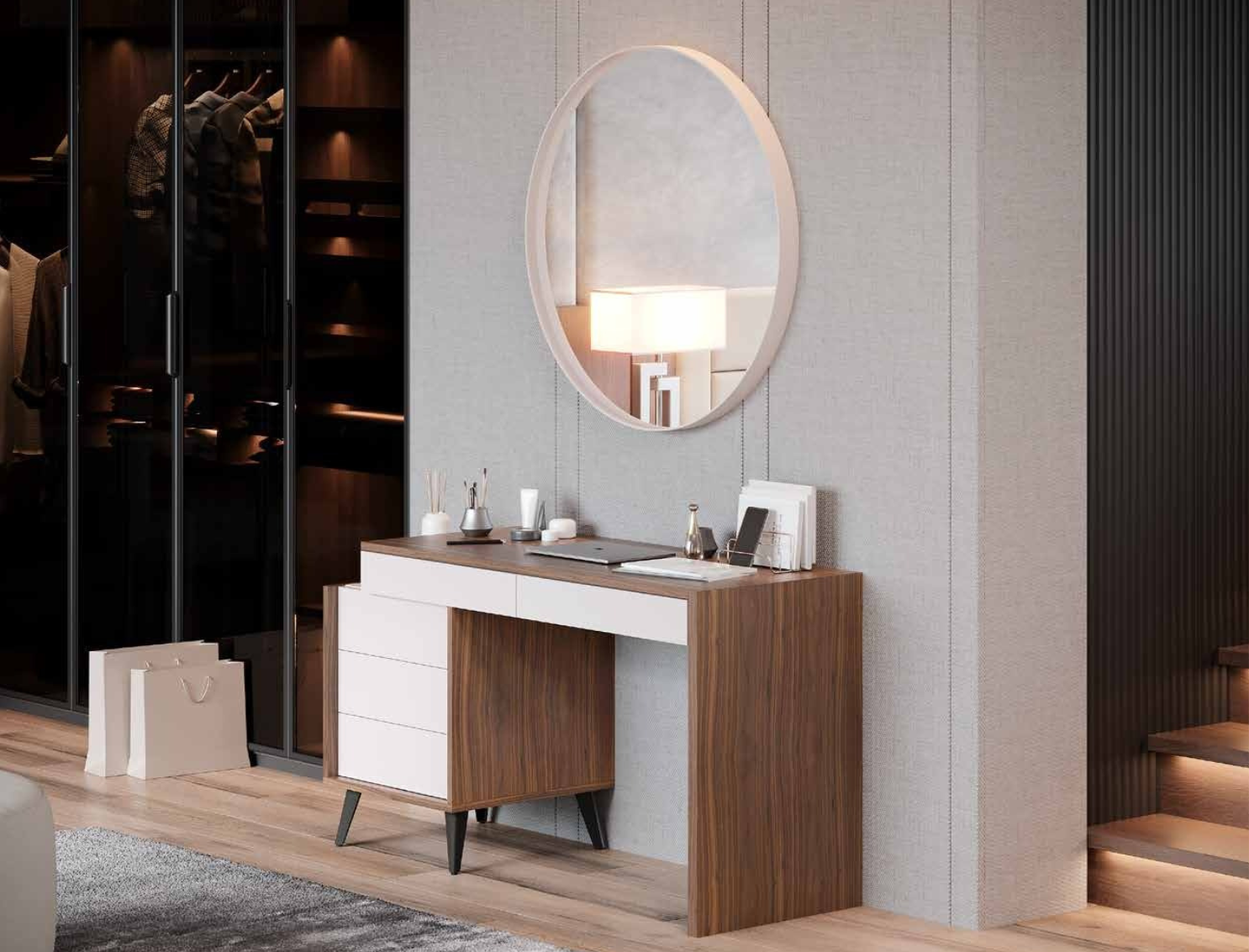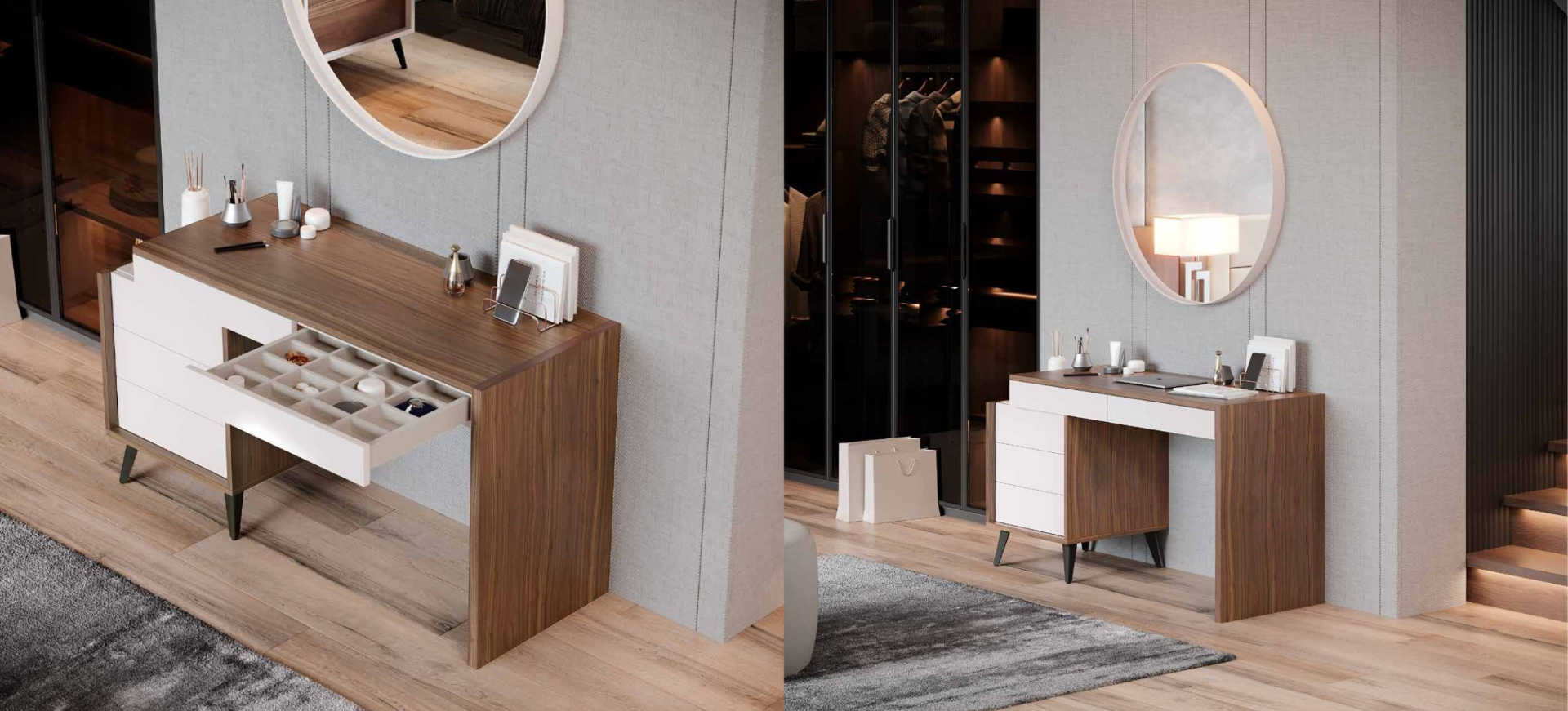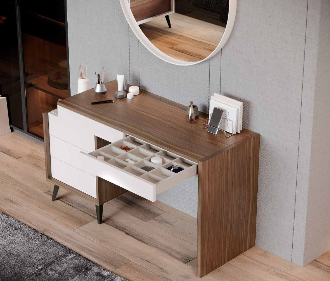 principal, o Toucador Capri oferece um módulo lateral com três gavetas